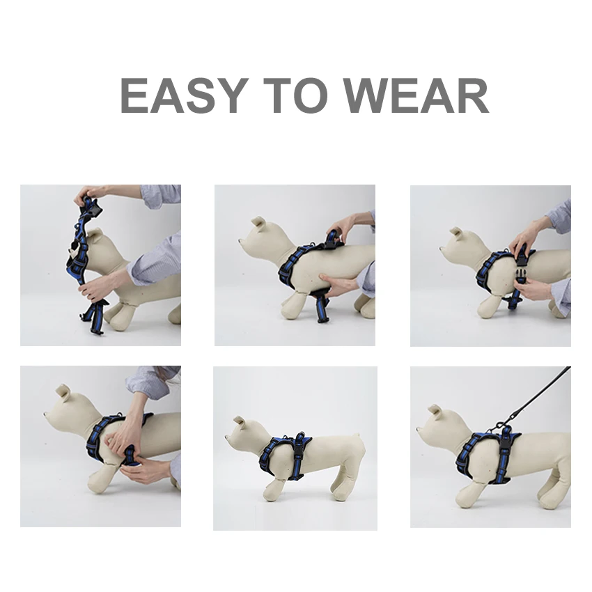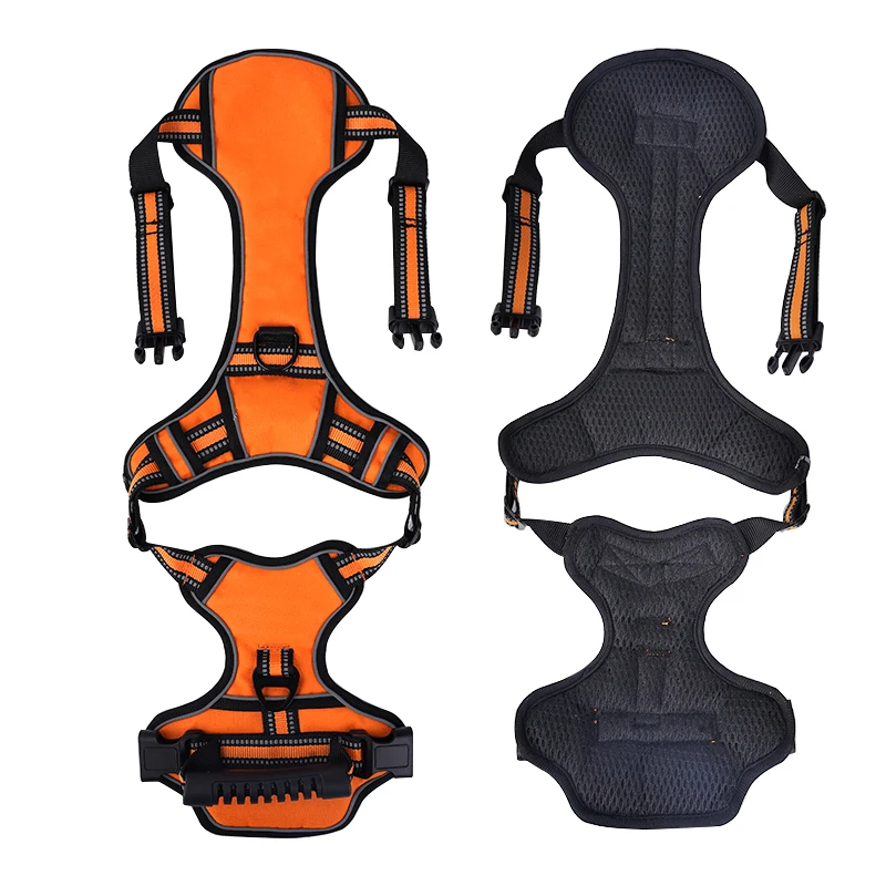 2 pontos de fixação de trela de metal resistentes com correias reforçadas, clipe frontal para puxar reconfortantes e costas para caminhadas descontraídas.Design ergonômico, a pressão de tração é distribuída uniformemente ao corpo para evitar asfixia.